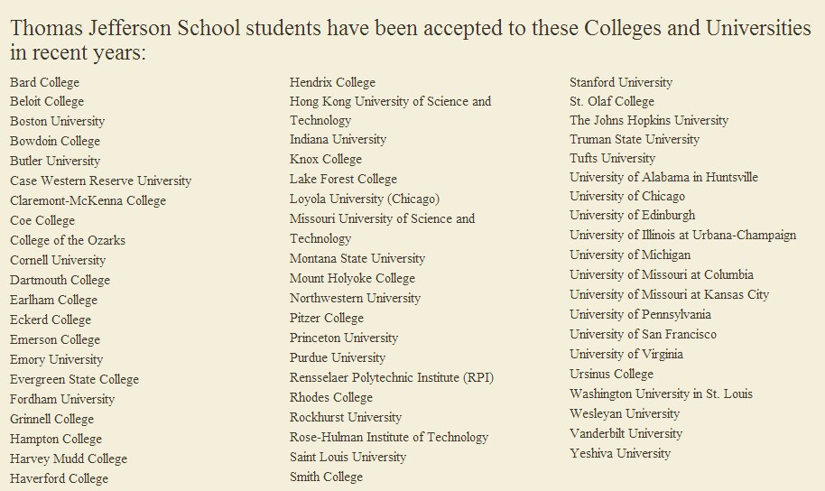 Thomas Jefferson School创立于1946年,坐落于密苏里州圣路易斯南郊区县的中间,是招收7-12年级的寄宿、走读均可的全日制学校。学校由Robin McCoy和Charles E. Merrill Jr.(美林银行创始人的儿子)和Graham Spring所建立的,他们当初的计划是在中西部成立一个有着和新英格兰地区的那些著名贵族寄宿中学同等水准的学校,并且学校的管理应该是类似与剑桥大学和牛津大学。学校共有82名学生,来自佛罗里达、伊利诺伊、印地安娜、堪萨斯、新墨西哥等大洲。其中约四分之一的人是国际学生,来自:中国、中国香港、中国台湾、日本、波兰、韩国等国家和地区。录取的学生皆为精英中的精英,学生享受的是美国最优秀的高中教育,学校是一所是侧重于古典教育的学校,并且有非常强的的数学方面的项目(所有学生都继续学习微积分)。历年来学校在美国私立中学毕业生SAT平均分的排名一直都在前15名之内。学校采取小班授课,师生比例:1:7。学校提供有竞争力的核心课程,提供14们AP课程和中高两级的ESL课程。Thomas Jefferson School offers extraordinary advantages for bright students of every background: a cosmopolitan, friendly community and a rigorous classical curriculum. For nearly 65 years, TJ’s program has emphasized no-nonsense depth in a required college-preparatory core: English, math, science, history, and both classical and modern languages. As a result, all graduates who entered by ninth grade have been trained in calculus and Greek. By senior year, all subjects are studied at the Advanced Placement level; most juniors take two AP classes. In an unparalleled year-round writing program—ancillary to Great Books seminars—teachers line-edit student précis, explications, and stylistic exercises. With a daily schedule of focused morning classes and a student/teacher ratio of 6:1, students enjoy generous individual attention, and supervised autonomy prepares them for the responsibility of college by allowing them to practice college life: appointments with teachers, study groups with peers, and afternoon tutorials. Day students share dorm space on a relaxed, park-like 20-acre campus with boarders from nine states and six countries. Five-day boarding is popular, even for some local families. The campus offers wireless Internet access, and new facilities (2009) enhance athletics and fine arts. Individualized college counseling led by the Head and senior faculty helps graduates go on to highly selective colleges. Average SAT scores consistently place TJ among the very top U.S. boarding schools. Over one-third of TJ’s